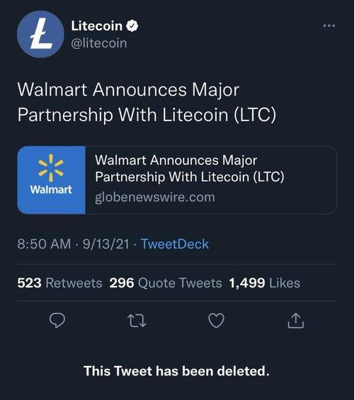 官方新闻稿派发平台Globe Newswire13日晚间9:00时突然刊登Walmart(沃尔玛)宣布与莱特币(LTC)合作一文,称美国最大零售商已接受LTC作为线上支付手段,此消息甚至获莱特币基金会推特转贴、各大国际主流媒体报导,各大加密货币全都受到鼓舞,全面急速疯涨。 然而,这个币圈前所未有的大好消息却在一个小时后迎来了180度回转,随着LTC基金会官方删文、各大媒体删除报导的诡异现象发生后的十分钟内,沃尔玛官方跳出来宣布此为假消息。 此事件引起了全体加密货币市场剧烈震荡,几乎全线暴涨后上升后秒迎来地狱急速暴跌,由于期货市场出现了大量爆仓现象,半数币种甚至比原先价格还要更低。 逼真的假消息,连LTC官方都转推 该则新闻稿指出,美国最大零售商沃尔玛(Walmart)宣布与LTC合作,LTC将为其全球数百万购物者提供使用加密货币无缝支付。新闻稿中甚至引述了沃尔玛CEO道格·麦克米伦(Doug Mc Millon)、LTC创办人查理·李(Charlie Lee)的发言,看起来相当逼真,LTC官方的推特甚至在当下跟着转推该则消息。