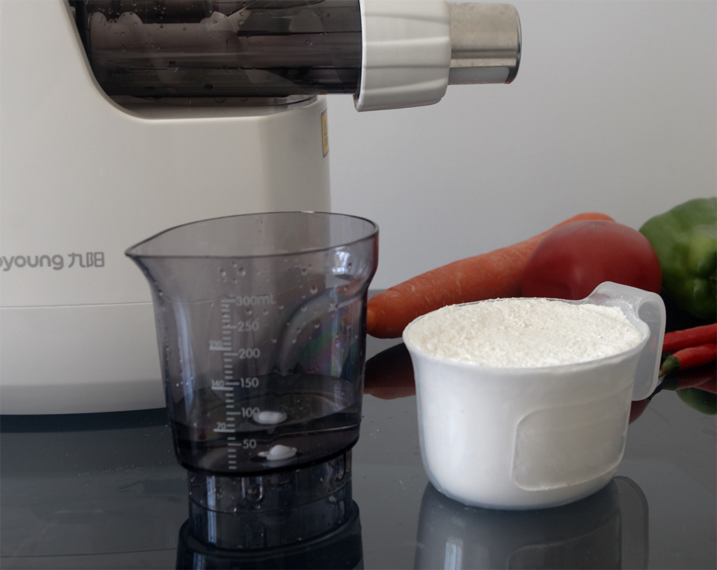 现在准备做面条了,先按照面水比例弄好了一平杯面粉和70毫升水,把面粉倒进和面的容器里,盖上杯盖,然后开机,我选的是快速面条,九阳面条机启动后,再把水量杯放到机器盖子上让它自动滴水。自动面条机工作时电机噪音还是有一点点的,但也不是很大。