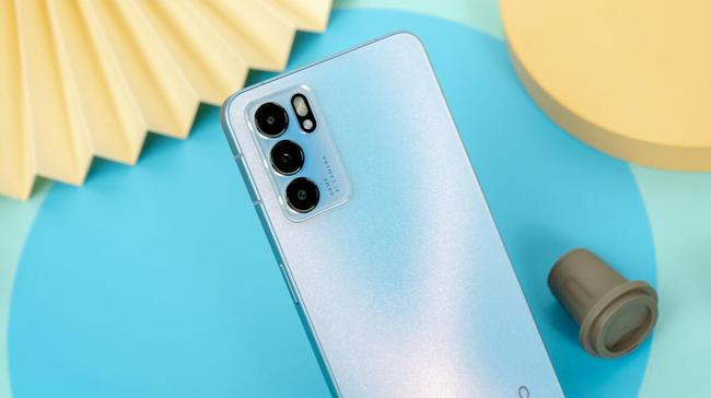 OPPO Reno6正面配备一块6.4英寸OLED屏幕,支持90Hz刷新率和180Hz触控采样率,光感屏幕指纹等,机身厚度为7.59mm,重量为182g,有夏日晴海、星河入梦、夜海和星黛紫四款配色,其中「夏日晴海」采用晶钻3.0工艺打造。