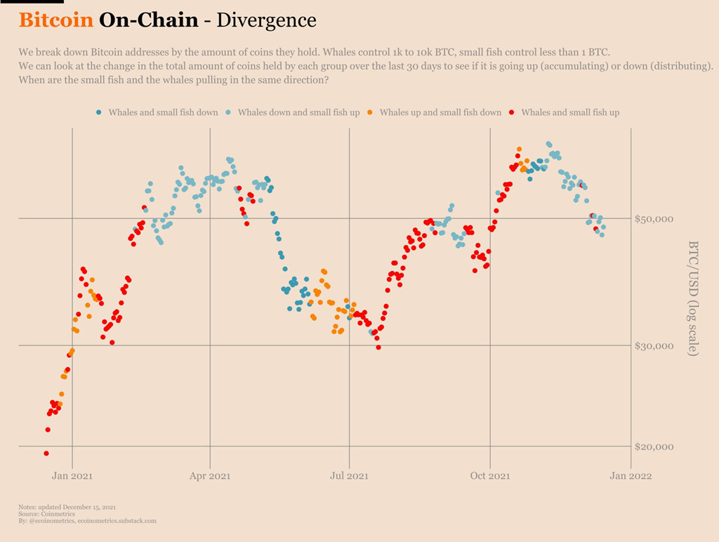 Delphi Digital总结道:有鉴于此,年底前最有可能出现更多震荡/横盘整理的价格走势,不过,任何伤害风险资产的重大风险规避事件或波动性飙升,都可能拖累比特币和更广泛的加密货币市场。 加密货币分析机构Jarvis Labs也有类似观点,认为市场将持续震荡,并指市场出现一些早期的筑底讯号,包括散户正在从近期跌势中买入等迹象,但该机构也提醒,短期持有者的已实现价格(Realized Price)为5.3万美元,在比特币突破此价格水平前,应保持谨慎。 总而言之,Jarvis Labs认为,4.2万美元现在是比特币的底部,但Jarvis Labs也警告,比特币需要快速恢复至5.3万美元之上。 巨鲸不再持续囤币 另外,值得注意的是,链上数据分析机构Ecoinometrics16日公布数据指出,持有一枚以下比特币的散户,正在持续买入比特币,但持有1000至1万枚比特币之间的巨鲸,却并没有在持续囤币,而这对比特币走势可能不太理想。