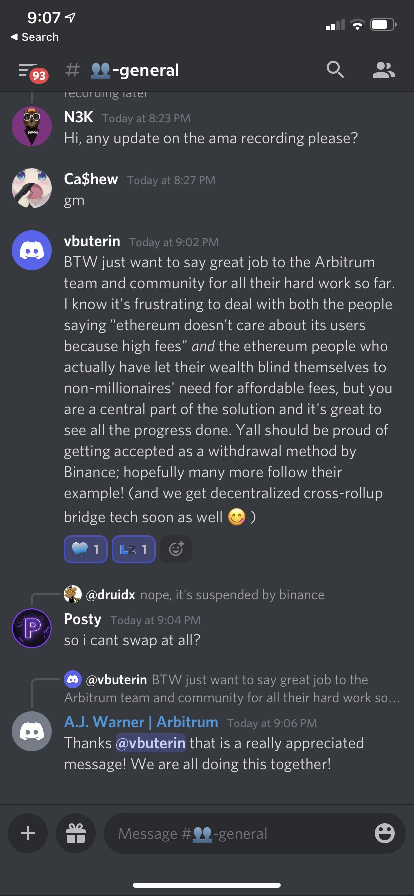 Zhu Su本人后续也转发了两则推特网友的推文,分别是要测试以太坊上的一些新产品,我需要一万美元才行,以及当我的朋友想进入ETH跟NFT时,我只能尴尬的解释Gas费用。 自从2020年初Defi兴起,爆发后的以太坊便一直以交易壅塞、手续费昂贵等问题闻名,这也让币安智链(BSC)、Solana、Cardano等主打更低廉的手续费的新兴公链跃上台面。 V神出面回应,选择向Arbitrum团队致谢 对于此事件,以太坊创者V神Vitalik Buterin现身回应,其并未正面回应Zhu Su的批评,而是选择在Discord频道向目前努力中的Arbitrum团队致谢:我知道要应对声称高手续费代表ETH不在乎用户的人、还有被财富蒙蔽双眼选择提高手续费的人很疲乏,但你们(指开发团队)是解决方案中的关键推手、很开心看到一切问题逐渐被搞定,你们都应该以被币安当成出金手段而感到骄傲,希望有更多人会Follow他们!